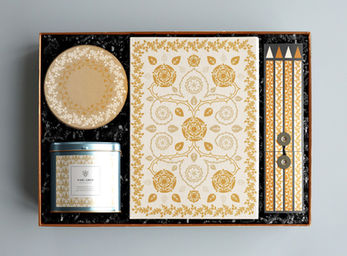 This is a limited edition gift set featuring a tin tea caddy, a coaster, a notebook and a pencil case. The theme for this project was "Tudor garden", which was designed using historic influences of the time period. The classic English roses, intricate floral motifs and curling vines create a sense of symmetry and grace, rendered in resplendent gold / soothing blue hues against a warm cream background. The design evokes heritage, craftsmanship, and romance of a bygone era.