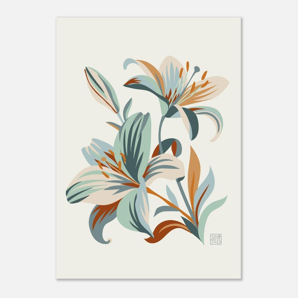 This contemporary floral print features stylised lilies in a soft sage green, muted terracotta, dusty blue, and warm cream. Bold yet balanced, the flowing shapes and layered colours bring a sense of calm movement and modern elegance. Designed to add warmth and character to a space. It works beautifully as a statement piece or as part of a considered gallery wall.